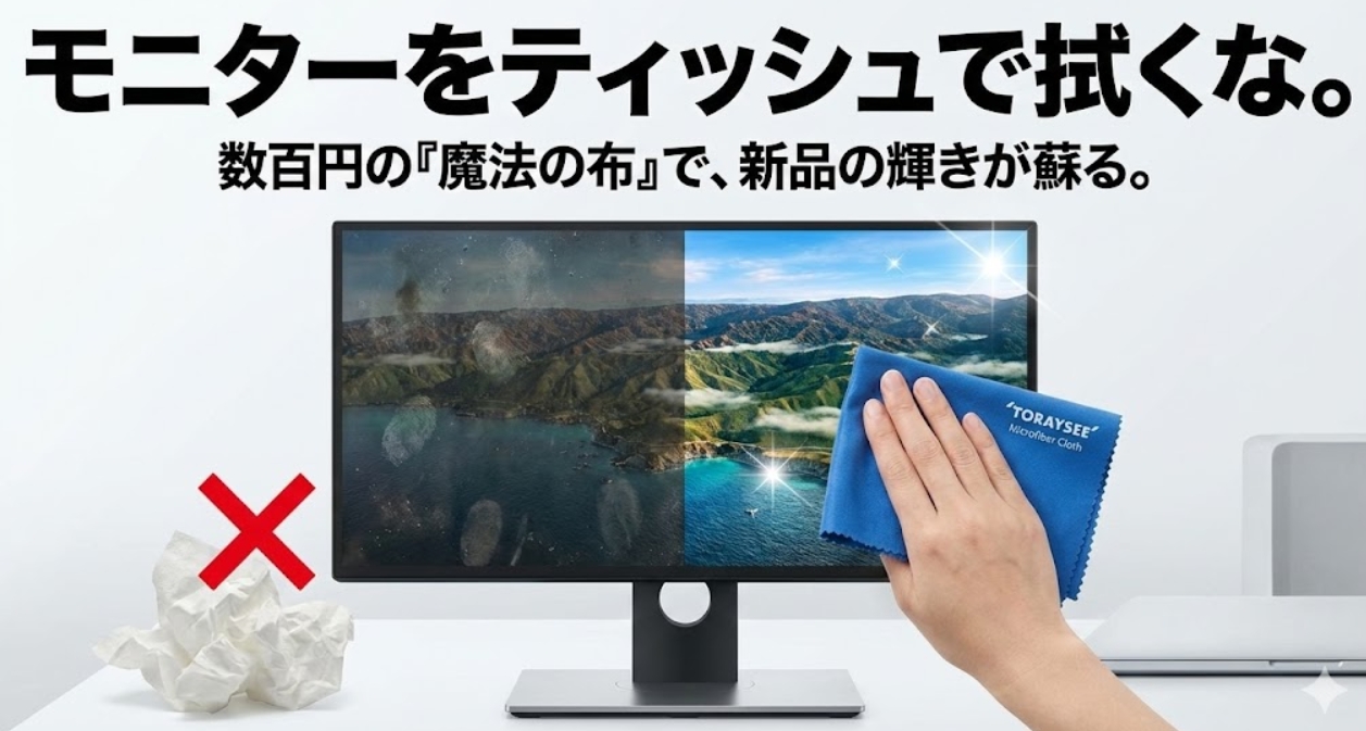 年末の大掃除。PCデスクを綺麗にするついでに、ふとモニターの画面を見てみてください。 電源を消して真っ黒になった画面に、点々とした唾(くしゃみ)の跡や、うっすら白い指紋、そして埃がこびりついていませんか? 「汚いな、ティッシュで拭くか」「ア... -