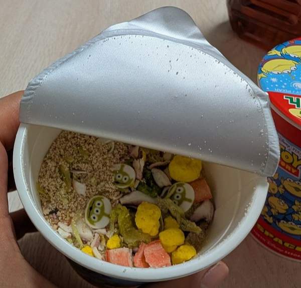 お湯を注いで3分待つと、エイリアンたちがふっくらと膨らみ、こちらの様子を伺ってきます。食べるのが可哀想になる可愛さです。